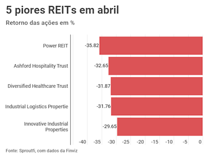 Neste artigo, você vai conhecer os 5 REITs que tiveram o melhor desempenho no mês de abril de 2022 – ou seja, as ações desse segmento com a maior valorização do mês. Também vamos mostrar quem ficou na lanterna: os 5 REITs com o pior desempenho. Os dados foram compilados da plataforma Finviz.