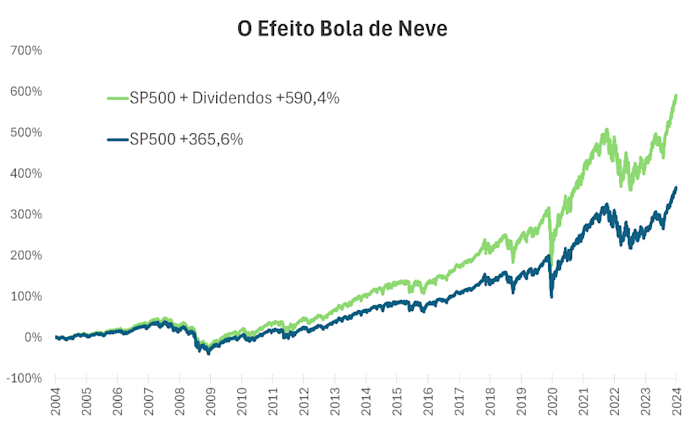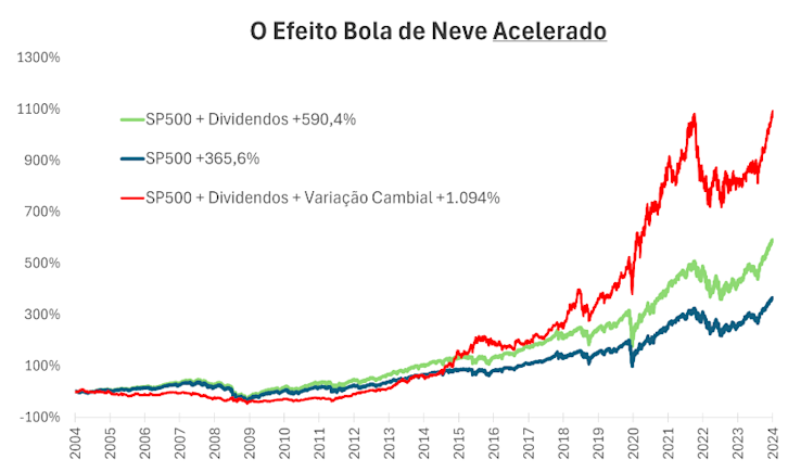 Cuando sumamos la variación del tipo de cambio – lo que yo llamo el efecto bola de nieve acelerado – la estrategia de reinversión de dividendos generó una ganancia acumulada en los últimos 20 años de +1.094% en reales, ¡o 13,20% anual!