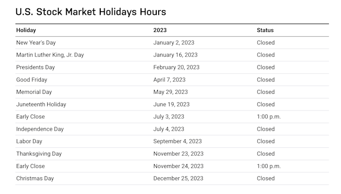 Por conta do número de feriados fixos em dias úteis, casos do 4 de julho e do Natal, haverão menos dias de funcionamento do mercado em 2023. Segundo levantamento da NYSE, serão 250 datas com o mercado ativo, um dia a menos do que em 2022.