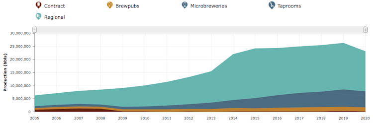Pero los números siguen siendo robustos: en dólares, el mercado total de la cerveza en Estados Unidos alcanzó los 94.000 millones de dólares en 2020. Las cervezas artesanales se llevaron el 22% de esa cantidad, 22.200 millones de dólares. A continuación se muestra un gráfico con la producción de cerveza artesanal en Estados Unidos desde 2005, en barriles, divididos en subcategorías como microcervecerías, pubs y cervecerías regionales -que se llevan la mayor parte y que en 2019 alcanzaría un máximo de más de 25 millones de barriles producidos.