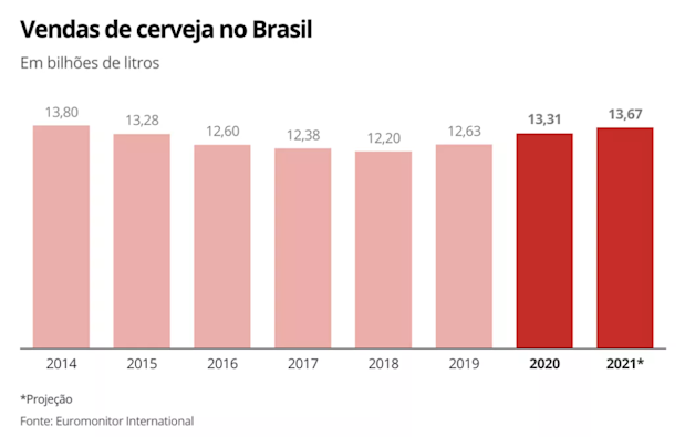 Por esa razón, a pesar de la crisis, el volumen de ventas de cerveza creció un 5% en 2020 en Brasil. En el mundo, el consumo de cerveza cayó un 12,5% en valor y un 6,8% en litros.