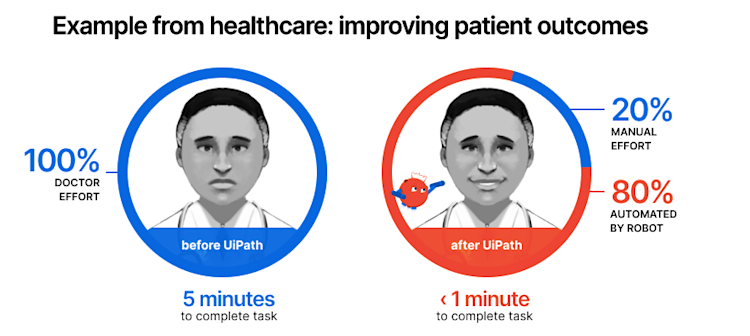 Abaixo, o resultado do uso de um software construído na plataforma no-code UiPath, para otimização da rotina de um médico. O robô executou 80% da tarefa, reduzindo de 5 min para 1 min o tempo para atualizar as informações do paciente no sistema. De 8 passos e cliques que o médico fazia, passou a precisar só de 3.