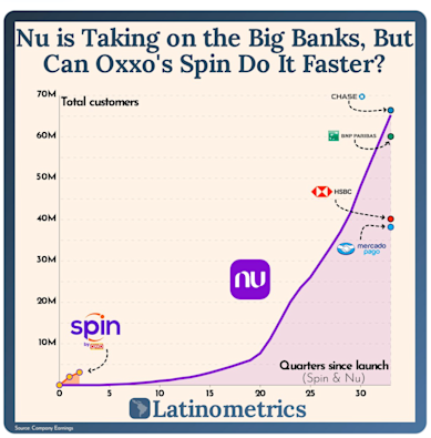 No entanto, o crescimento do Spin by Oxxo tem sido mais rápido do que o Nubank. De acordo com o Latinometrics, a fintech brasileira demorou muito mais tempo do que o Oxxo para atingir um mesmo patamar de clientes.