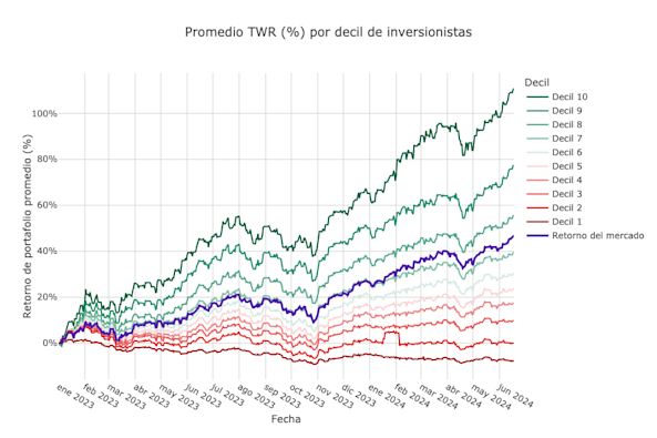 Esta gráfica muestra el rendimiento de los inversionistas de Vest desde enero de 2023, agrupados según su rango de Inversionista Vest. El 10% superior de los inversionistas está en el 'Decil 10', mientras que los de menor rendimiento están en el 'Decil 1'.