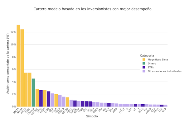 Hay varias cosas interesantes sobre la cartera de los top inversionistas de Vest. Por un lado, los Magnificent Seven ($Meta, $Microsoft, $Nvidia, $Amazon, $Apple, $Google, $Tesla, $Netflix) representan el 42% de la cartera, con Meta y Nvidia, ganadores del auge de la IA, representando el 25% del total de la cartera.
