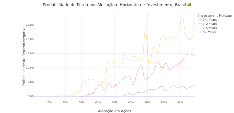 O passado não necessariamente prevê o futuro, mas é o melhor que temos para trabalhar se quisermos tomar decisões baseadas em dados. Para entender as relações entre horizonte de investimento, volatilidade e retorno, rodamos 100.000 simulações para cada mercado, escolhendo aleatoriamente diferentes intervalos de tempo dentro da janela completa de 18 anos e estudando como carteiras com diferentes combinações de ações e renda fixa local se comportaram.