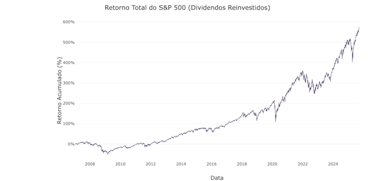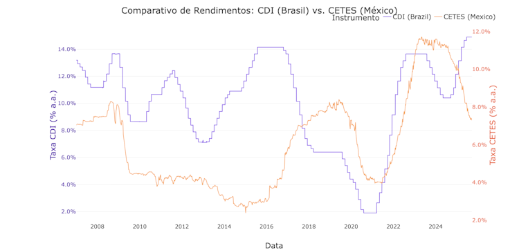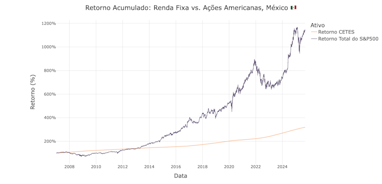 Ao longo deste período de 18 anos, as ações americanas entregaram um retorno total de mais de 1.600% para investidores brasileiros e quase 1.200% para investidores mexicanos, superando decisivamente a renda fixa local. Isso é resultado tanto do crescimento do mercado de ações americano quanto da valorização do dólar ao longo do período, criando um efeito de composição dupla.