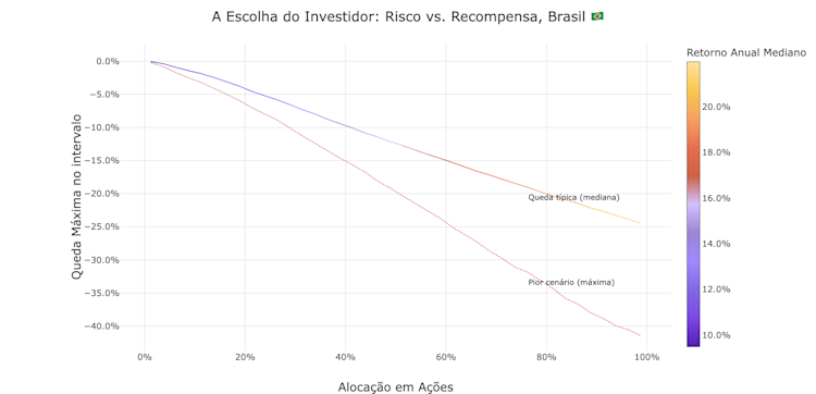 Eixo Y: A queda potencial no valor da sua carteira. A linha sólida é a queda típica em uma desaceleração; a linha pontilhada é o cenário de crise de pior caso.