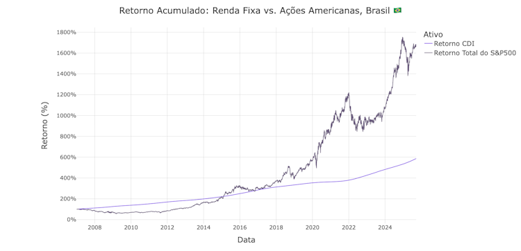Ações americanas entregaram retornos extraordinários para investidores latino-americanos, gerando mais de 1.600% para brasileiros e quase 1.200% para mexicanos desde 2007, superando decisivamente a renda fixa local.