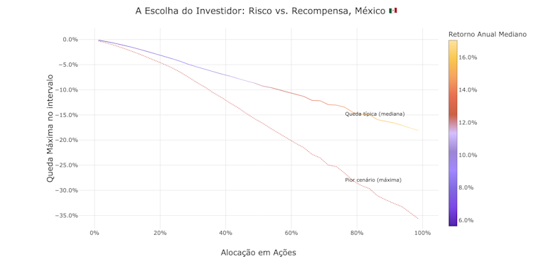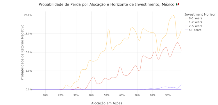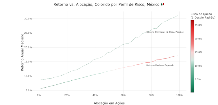 Esses gráficos geralmente contam a mesma história: mais risco, mais retorno. O insight chave, no entanto, é que mesmo uma quantidade muito pequena de alocação em ações americanas cria muito espaço para surpresas positivas: com apenas 1,2% de alocação em S&P500, o retorno previsto da carteira brasileira variou entre 9,5% e 13,1%. No México, variou entre 5,6% e 8,6%.