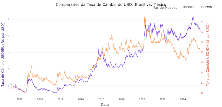 Para um investidor brasileiro ou mexicano, deter ações americanas também é uma posição no dólar americano, que se valorizou substancialmente ao longo do período estudado. Mais recentemente, desde a COVID, o peso basicamente ficou estável contra o dólar, enquanto o real se desvalorizou consideravelmente: