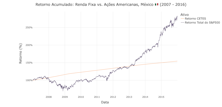 Então por que não apostar tudo em ações americanas? Porque mesmo que elas geralmente tenham subido, elas também podem cair. De 2007 a 2014 – por um período de 7 anos – investidores mexicanos e brasileiros teriam ficado melhor, em grande parte, mantendo-se na renda fixa: